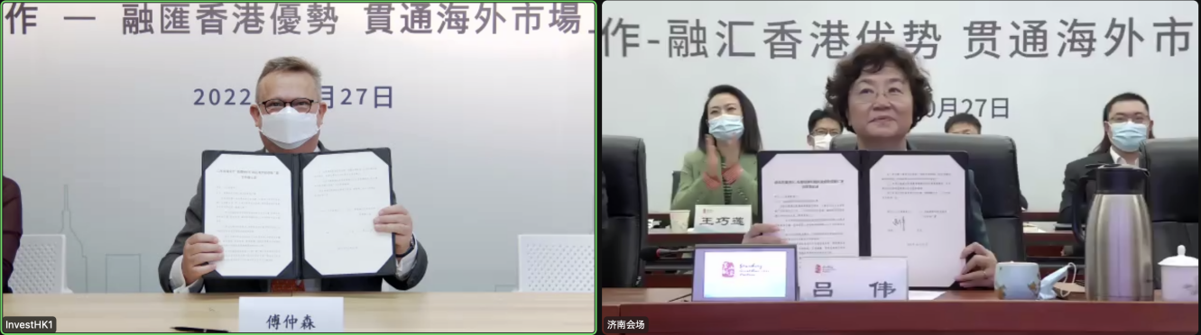 10月27日,由香港特别行政区政府投资推广署、中央人民政府驻香港特别行政区联络办公室经济部贸易处、山东省商务厅共同主办的“鲁港合作─融汇香港优势贯通海外市场”研讨会以线上线下相结合的方式举行。香港投资推广署、法国巴黎银行、安永税务及咨询有限公司、香港交易所分别推介了香港的营商优势和合作机遇,山东能源集团、歌尔股份有限公司分享了通过香港平台开展海外业务的经验。驻港和山东企业代表等近200人线上线下参会。研讨会上,香港投资推广署署长傅仲森、山东省商务厅副厅长吕伟代表双方签署了合作备忘录,将在营商环境环境、双向投资、海外新市场开拓、人才培训等方面加强合作。
