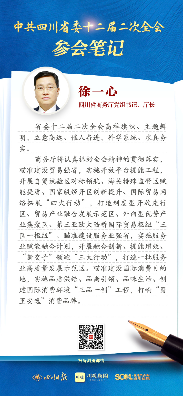 商务厅将认真抓好全会精神的贯彻落实,瞄准建设贸易强省,实施开放平台提能工程,开展自贸试验区对标领航、海关特殊监管区赋能提质、国家级经开区创新提升、国际贸易网络拓展“四大行动”,打造制度型开放先行区、贸易产业融合发展示范区、外向型优势产业集聚区、第三亚欧大陆桥国际贸易枢纽“三区一枢纽”。瞄准建设服务业强省,实施服务业赋能融合计划,开展融合创新、提能增效、“新交子”领跑“三大行动”,打造一批服务业高质量发展示范区。瞄准建设国际消费目的地,实施品质供给、品尚引领、品味生活、创建国际消费环境“三品一创”工程,打响“蜀里安逸”消费品牌。