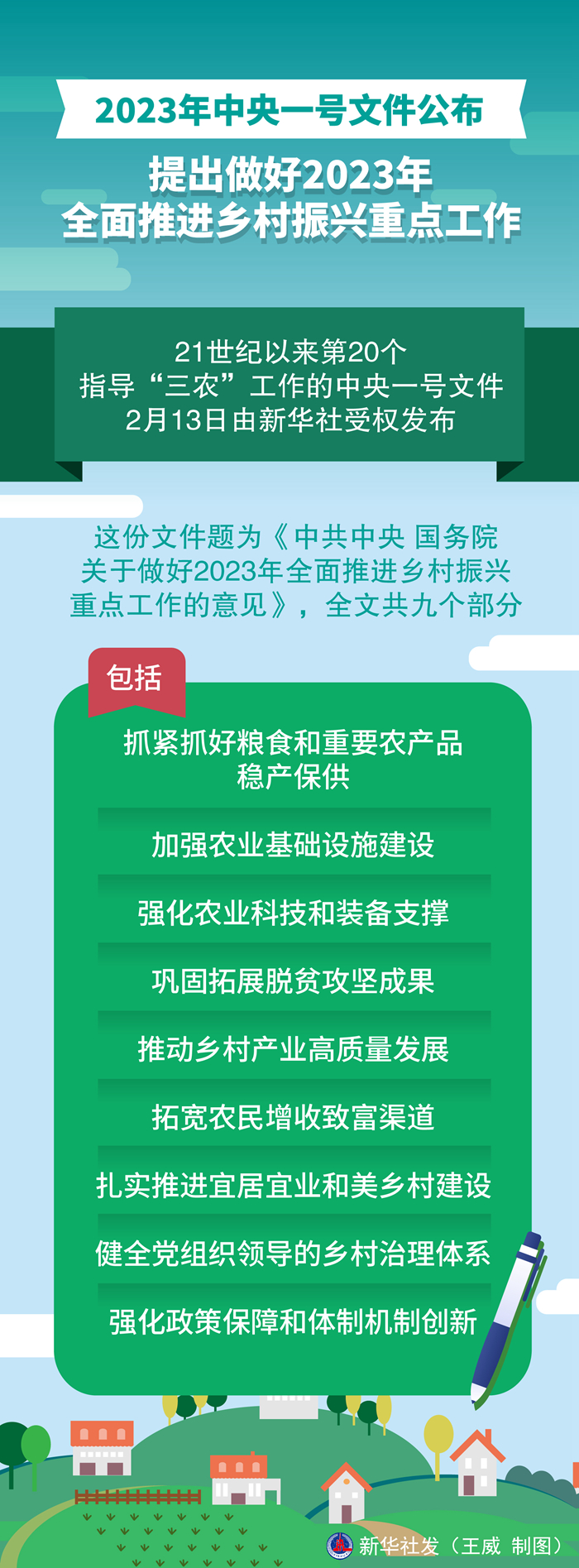 这份文件题为《中共中央 国务院关于做好2023年全面推进乡村振兴重点工作的意见》,全文共九个部分,包括:抓紧抓好粮食和重要农产品稳产保供、加强农业基础设施建设、强化农业科技和装备支撑、巩固拓展脱贫攻坚成果、推动乡村产业高质量发展、拓宽农民增收致富渠道、扎实推进宜居宜业和美乡村建设、健全党组织领导的乡村治理体系、强化政策保障和体制机制创新。