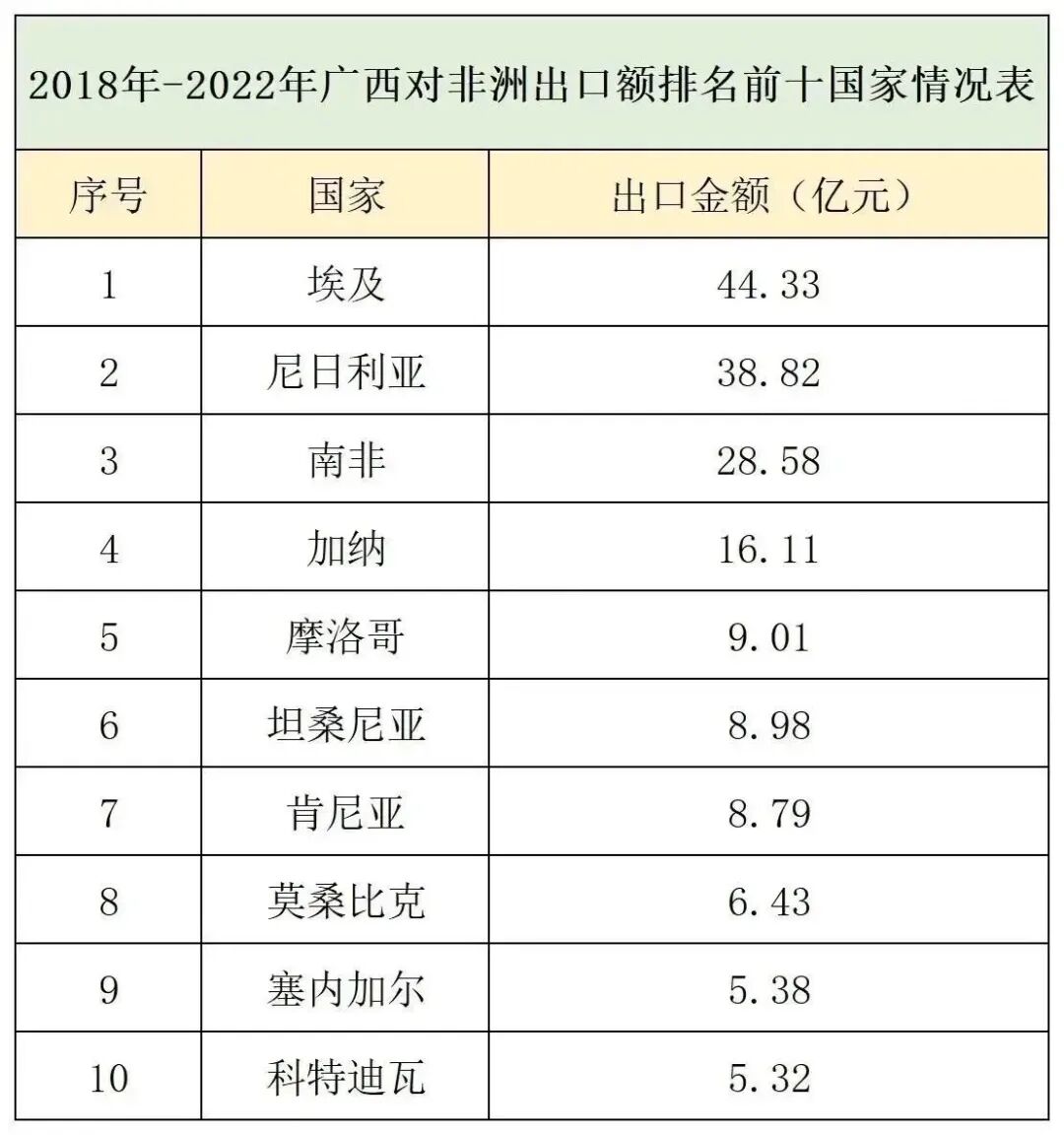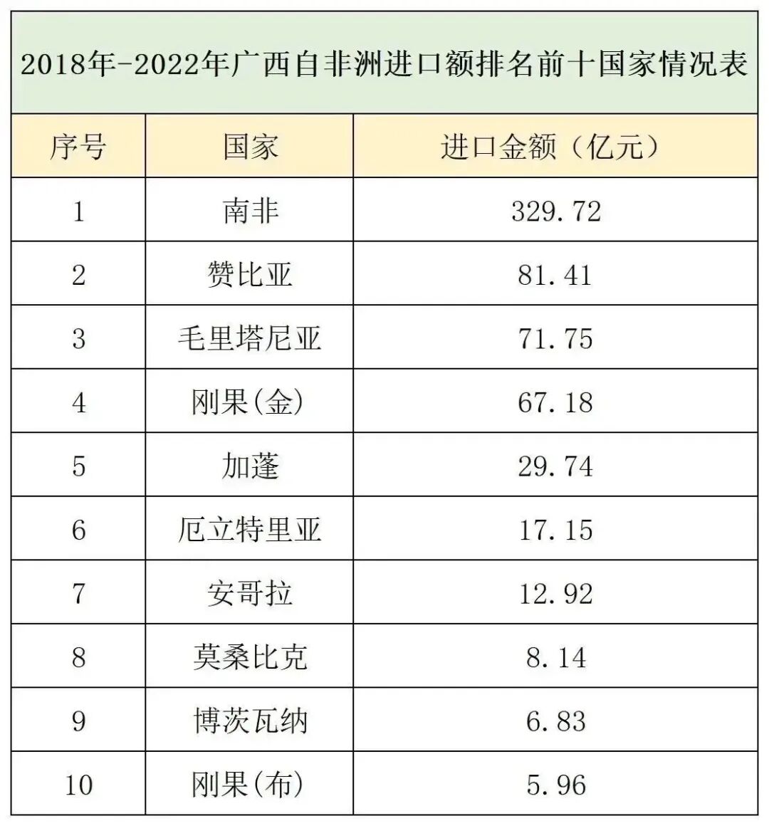 2018年-2022年,广西与非洲进出口总额为910.3亿元,同比增长17.2%,其中,出口249.3亿元,同比增长26.3%,进口661亿元,同比增长16.7%。