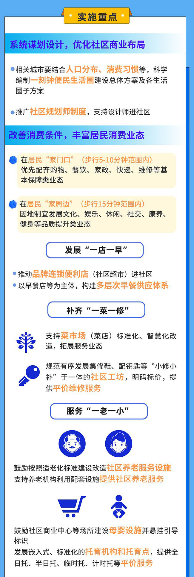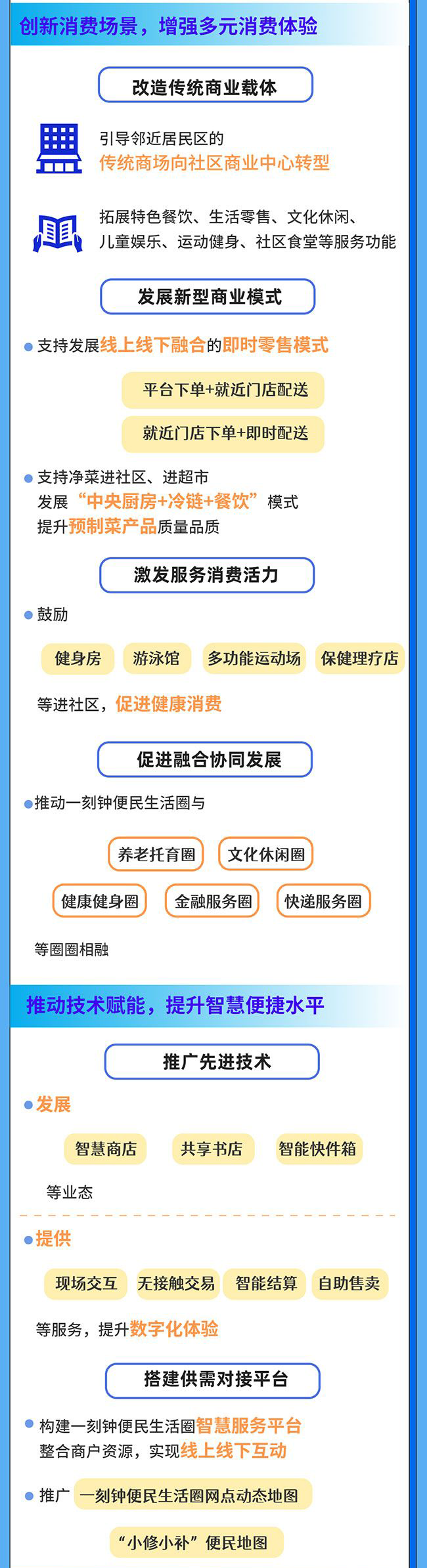 改造传统商业载体,引导邻近居民区的传统商场向社区商业中心转型,拓展特色餐饮、生活零售、文化休闲、儿童娱乐、运动健身、社区食堂等服务功能。