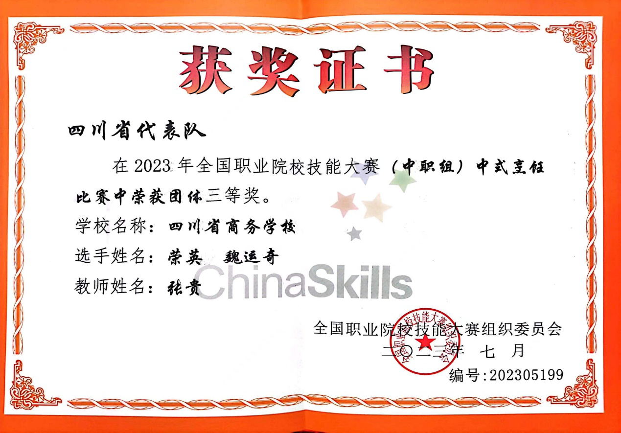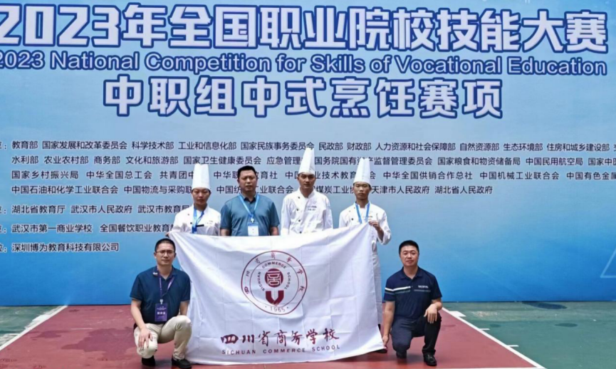 7月29日,2023年全国职业院校技能大赛(中职组)中式烹饪赛项在武汉开赛。此次大赛为师生同赛,共有来自全国70支参赛队、210名选手同台竞技“中式热菜制作、中式面点制作、冷拼与雕刻”三个项目,现场烹制美味佳肴,打造“舌尖上的盛宴”。四川省商务学校教师张贵和学生荣英、魏运奇组成的代表队荣获大赛团体三等奖。