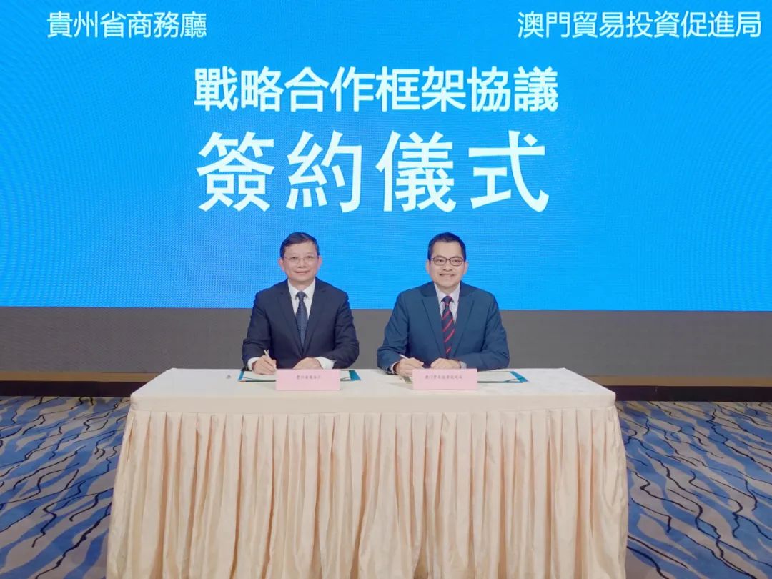 座谈会后,马雷同余雨生共同签署了《贵州省商务厅与澳门贸易投资促进局战略合作框架协议》。双方将在贸易投资促进、展会、产业发展、搭建贵州与葡语国家经贸合作桥梁等方面加强合作。