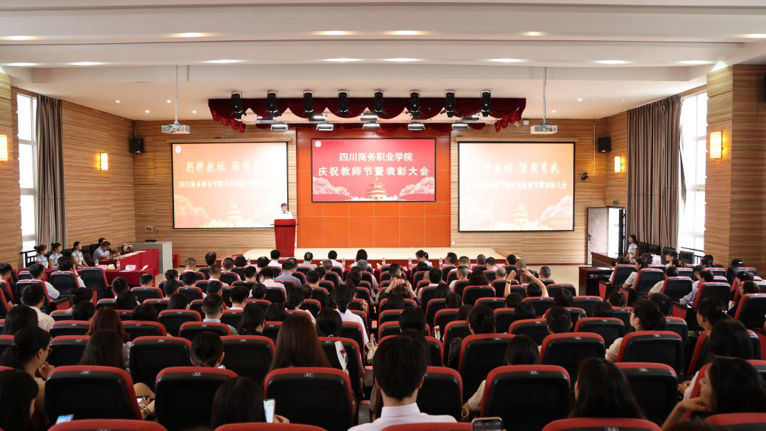 9月8日,四川商务职业学院在和盛校区商务信息交流中心隆重举行庆祝第39个教师节暨表彰大会。受商务厅党组书记、厅长徐一心的委托,厅党组成员、副厅长尹奇志率人事教育处处长林辉丽、机关党委专职副书记黄小玲、办公室副主任周蒋强一行莅临大会指导。会议由学院党委副书记、院长高司华主持。