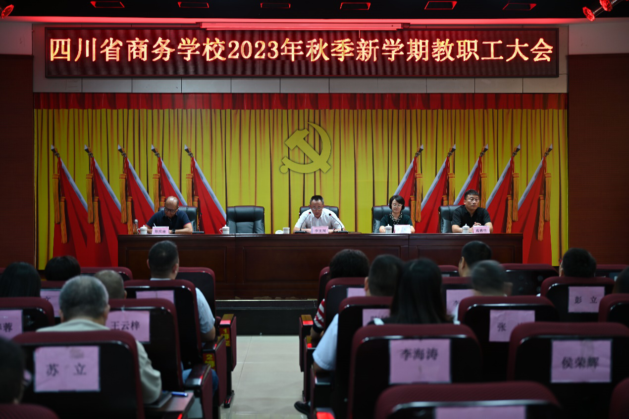 为更好总结回顾上学期的工作情况,明确新学期的工作目标、要求,充分调动全体教职工的工作积极性,9月1日上午,四川省商务学校在多功能厅召开了2023年秋季学期教职工大会。党委书记、校长李文川,党委副书记张旭,党委委员、纪委书记刘永萍,党委委员、副校长陈庆林、葛惠伟及全体教职工参加会议。会议由张旭副书记主持。