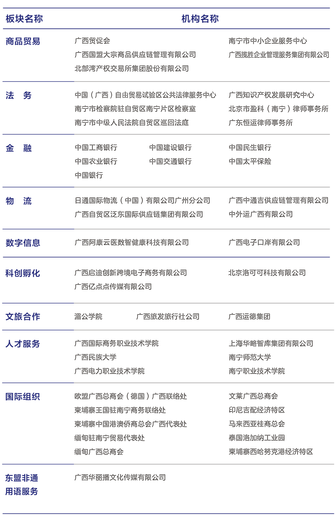 商贸投资、法务、金融、物流、数字信息、科创孵化、文旅合作、人才、国际组织、东盟非通用语。