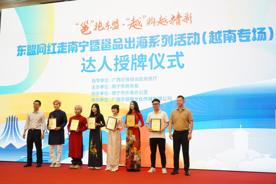 现场活动组委会为15名越南网红主播颁发“邕优品”、“邕品出海”电商推广达人牌匾。