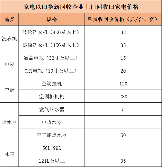由第三方上门对冰箱、洗衣机、电视机、空调、热水器废旧家电进行回收,给予最高280元/套空调柜机的回收补贴。