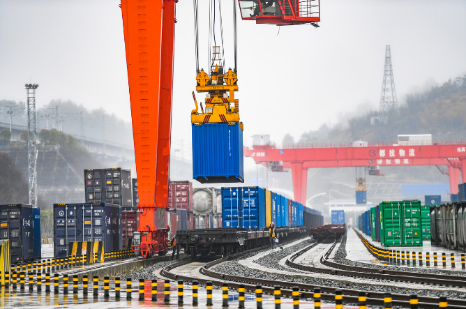 一列中欧班列在贵阳国际陆港都拉营站装载集装箱。贵州日报天眼新闻记者 邓刚 摄